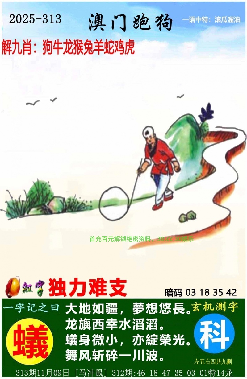 317期:【跑狗特码诗】开:發00 玄机诗:傷春悲秋,善感多愁,倚坐欹眠日己中。物換星移,誰主沉浮,天涯流浪经时节。 诗句解:图中是一红衣男子手里拿着锄头在田地里劳作,红衣解红波的特码数。锄头解金属解金肖的生肖猴、生肖鸡。男子解男肖的生肖鼠、牛、虎、龙、马、猴、狗。大地回春指冬尽春来,草木萌生,大地上呈现一片欣欣向荣的景象。解春肖的生肖兔、虎、龙。 跑狗六肖:猴兔鸡牛狗虎 跑狗五肖:猴兔鸡牛狗 跑狗三肖:猴兔鸡 跑狗一肖:猴 跑狗单双:双肖 跑狗波色:红波+绿波 ![]() |